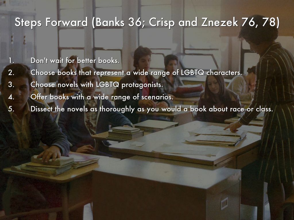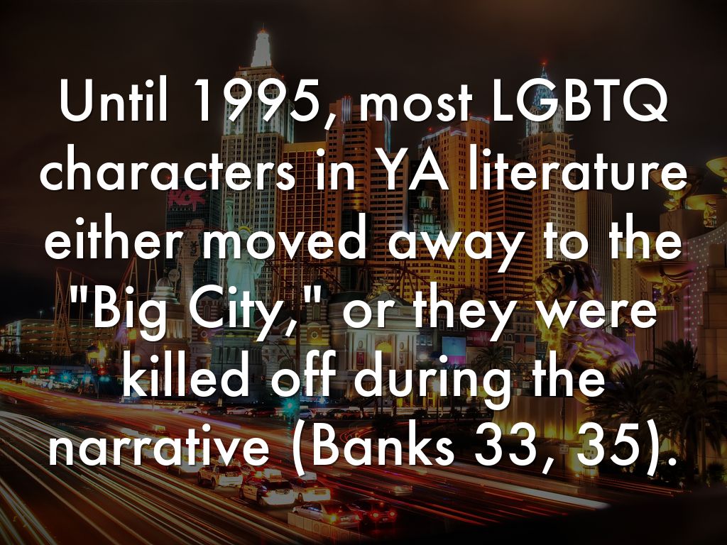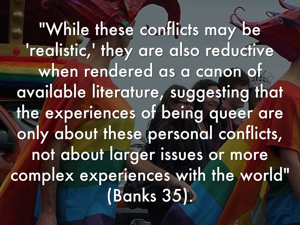 "While these conflicts may be 'realistic,' they are also reductive when rendered as a canon of available literature, suggesting that the experiences of being queer are only about these personal conflicts, not about larger issues or more complex experiences with the world" (Banks 35).