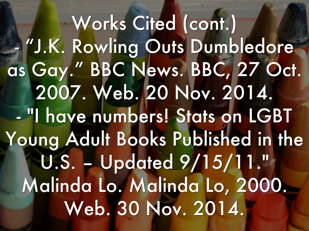 Works Cited (cont.) - “J.K. Rowling Outs Dumbledore as Gay.” BBC News. BBC, 27 Oct. 2007. Web. 20 Nov. 2014. - "I have numbers! Stats on LGBT Young Adult Books Published in the U.S. – Updated 9/15/11." Malinda Lo. Malinda Lo, 2000. Web. 30 Nov. 2014.