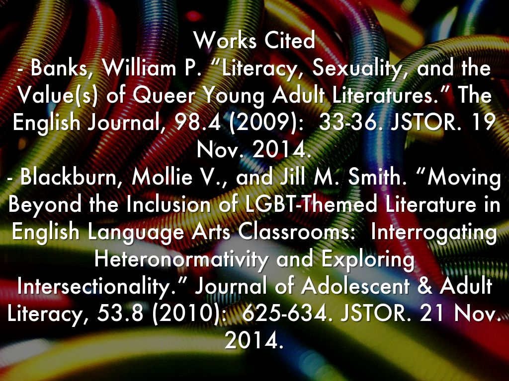 Works Cited - Banks, William P. “Literacy, Sexuality, and the Value(s) of Queer Young Adult Literatures.” The English Journal, 98.4 (2009): 33-36. JSTOR. 19 Nov. 2014. - Blackburn, Mollie V., and Jill M. Smith. “Moving Beyond the Inclusion of LGBT-Themed Literature in English Language Arts Classrooms: Interrogating Heteronormativity and Exploring Intersectionality.” Journal of Adolescent & Adult Literacy, 53.8 (2010): 625-634. JSTOR. 21 Nov. 2014.