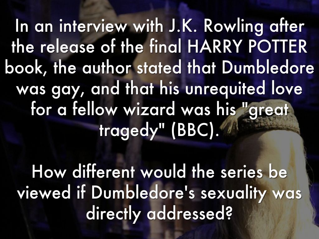 In an interview with J.K. Rowling after the release of the final HARRY POTTER book, the author stated that Dumbledore was gay, and that his unrequited love for a fellow wizard was his "great tragedy" (BBC).