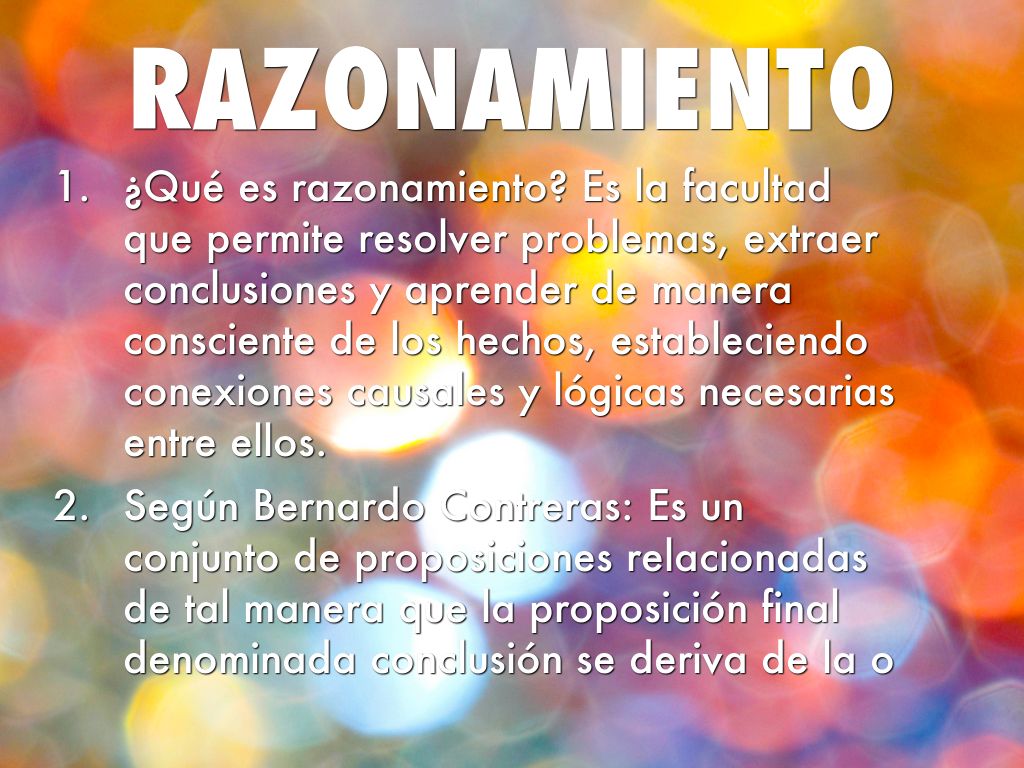 • ¿Qué es razonamiento? Es la facultad que permite resolver problemas, extraer conclusiones y aprender de manera consciente de los hechos, estableciendo conexiones causales y lógicas necesarias entre ellos.