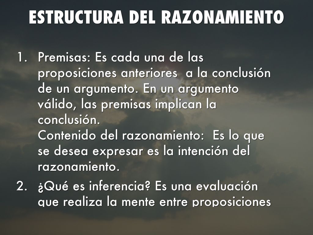 • Premisas: Es cada una de las proposiciones anteriores a la conclusión de un argumento. En un argumento válido, las premisas implican la conclusión. Contenido del razonamiento: Es lo que se desea expresar es la intención del razonamiento.
