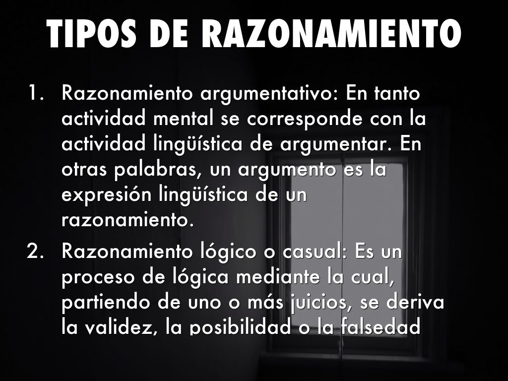 • Razonamiento argumentativo: En tanto actividad mental se corresponde con la actividad lingüística de argumentar. En otras palabras, un argumento es la expresión lingüística de un razonamiento.