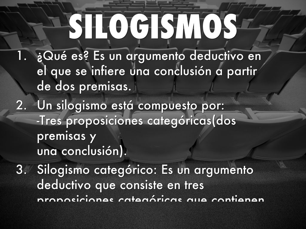 • Silogismo categórico: Es un argumento deductivo que consiste en tres proposiciones categóricas que contienen exactamente tres términos, cada uno de los cuales sólo aparece en dos de las proposiciones que lo constituyen.
