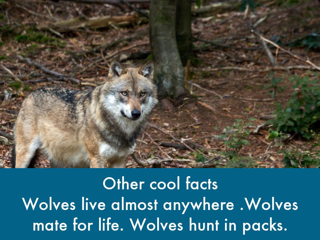 Wolves live almost anywhere .Wolves mate for life. Wolves hunt in packs.