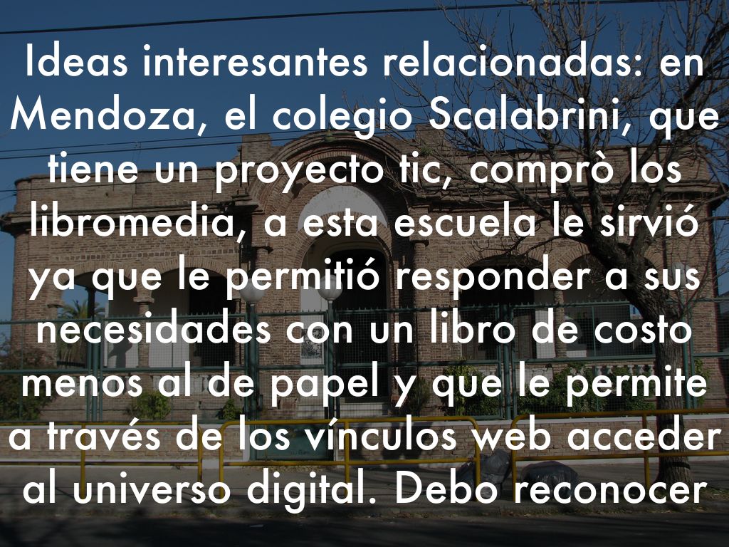 Ideas interesantes relacionadas: en Mendoza, el colegio Scalabrini, que tiene un proyecto tic, comprò los libromedia, a esta escuela le sirvió ya que le permitió responder a sus necesidades con un libro de costo menos al de papel y que le permite a través de los vínculos web acceder al universo digital. Debo reconocer que resultó demasiado engo
