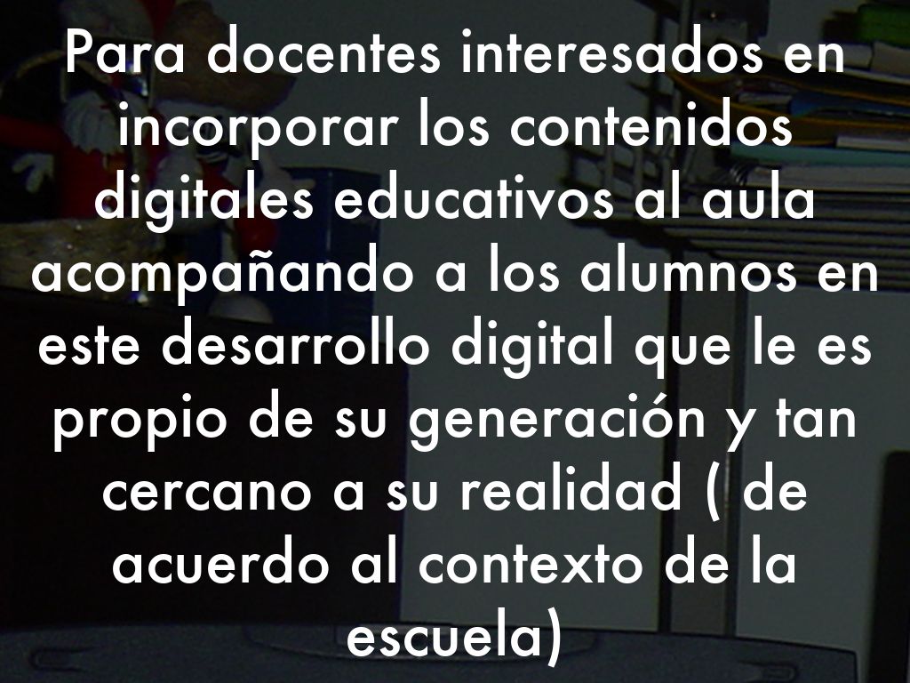Para docentes interesados en incorporar los contenidos digitales educativos al aula acompañando a los alumnos en este desarrollo digital que le es propio de su generación y tan cercano a su realidad ( de acuerdo al contexto de la escuela)