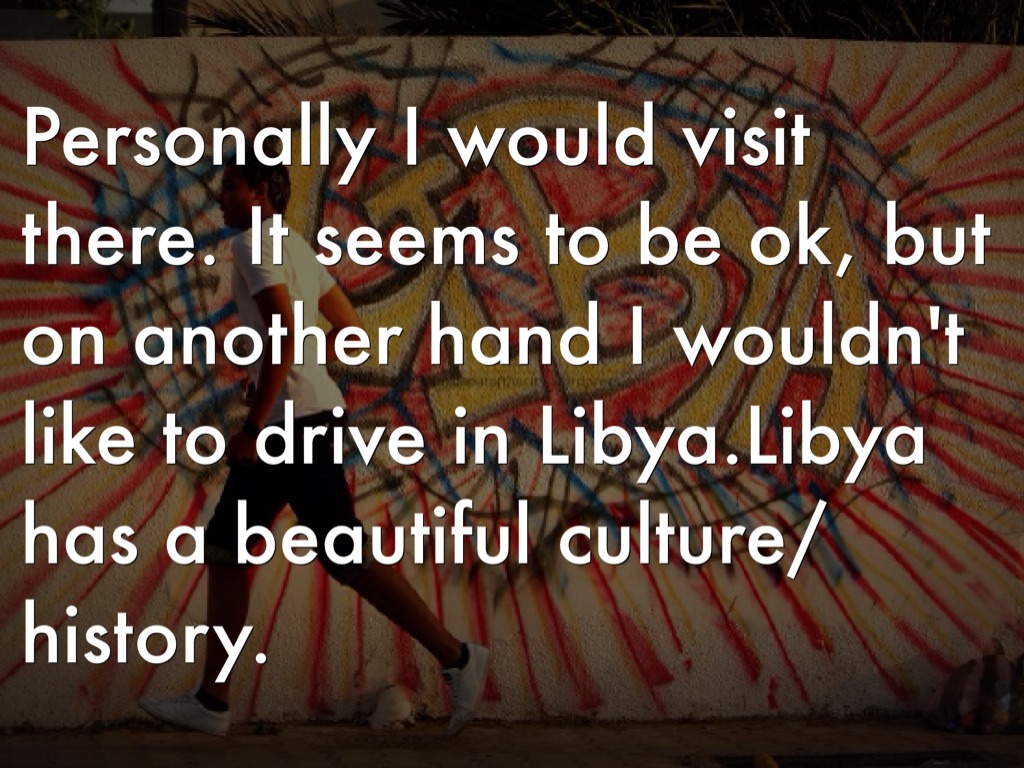 Personally I would visit there. It seems to be ok, but on another hand I wouldn't like to drive in Libya.Libya has a beautiful culture/history.