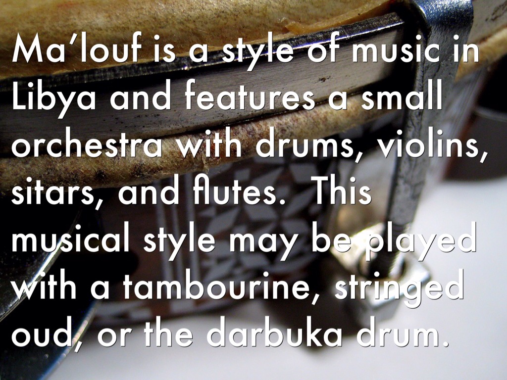 Ma’louf is a style of music in Libya and features a small orchestra with drums, violins, sitars, and flutes. This musical style may be played with a tambourine, stringed oud, or the darbuka drum.