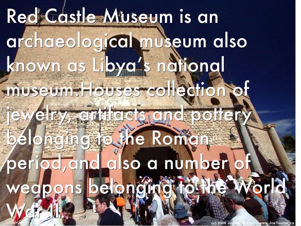 Red Castle Museum is an archaeological museum also known as Libya’s national museum.Houses collection of jewelry, artifacts and pottery belonging to the Roman period,and also a number of weapons belonging to the World War II.