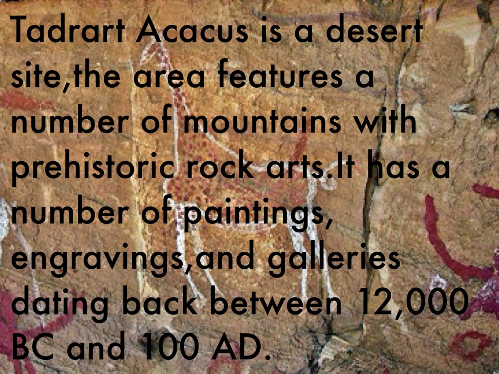 Tadrart Acacus is a desert site,the area features a number of mountains with prehistoric rock arts.It has a number of paintings,