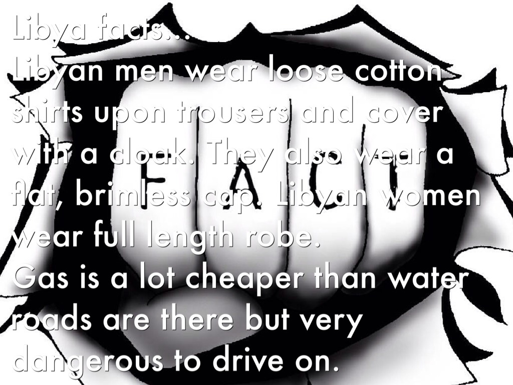 Libyan men wear loose cotton shirts upon trousers and cover with a cloak. They also wear a flat, brimless cap. Libyan women wear full length robe.
