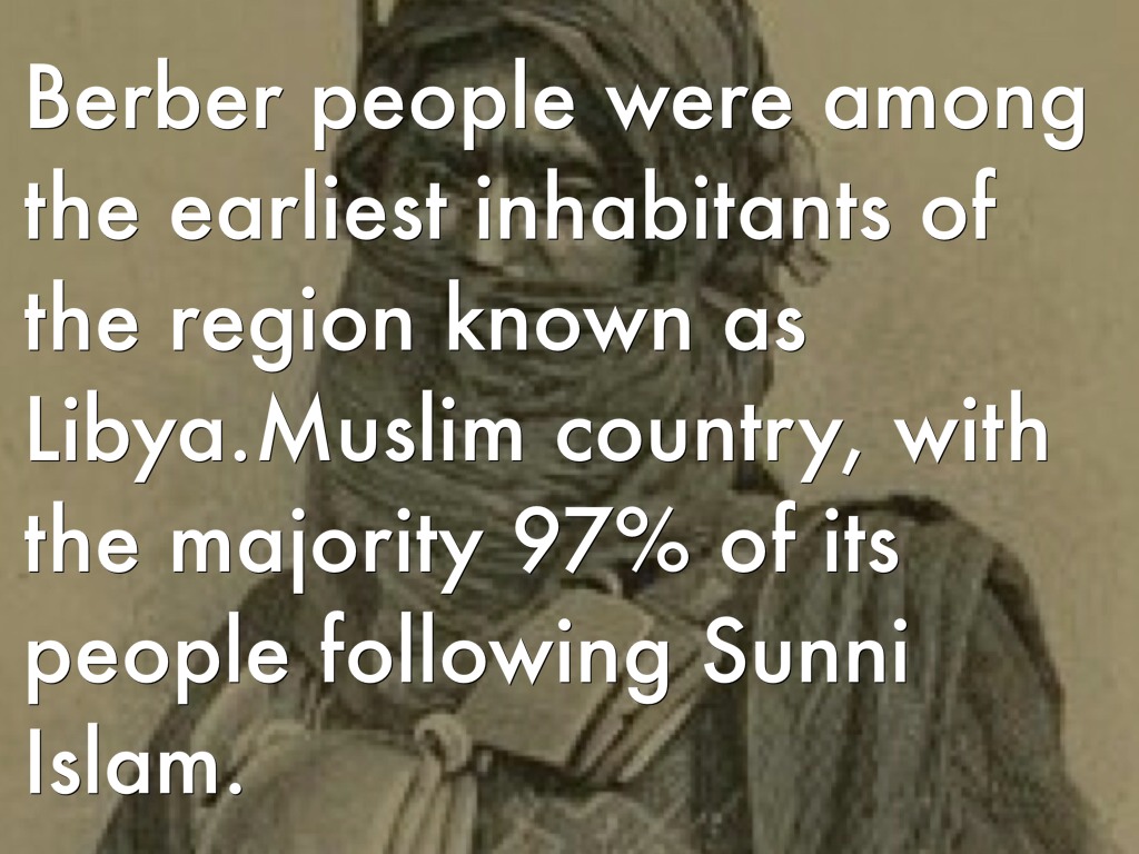 Berber people were among the earliest inhabitants of the region known as Libya.Muslim country, with the majority 97% of its people following Sunni Islam.