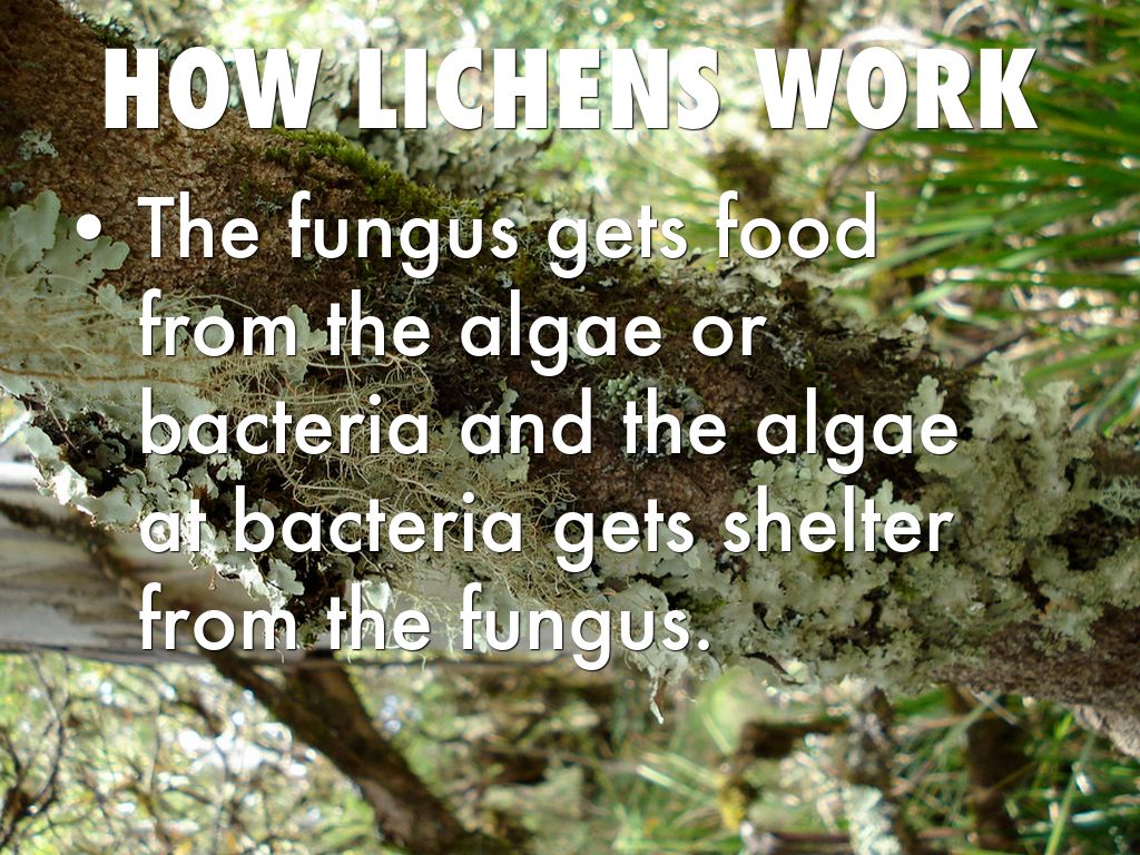 The fungus gets food from the algae or bacteria and the algae at bacteria gets shelter from the fungus.