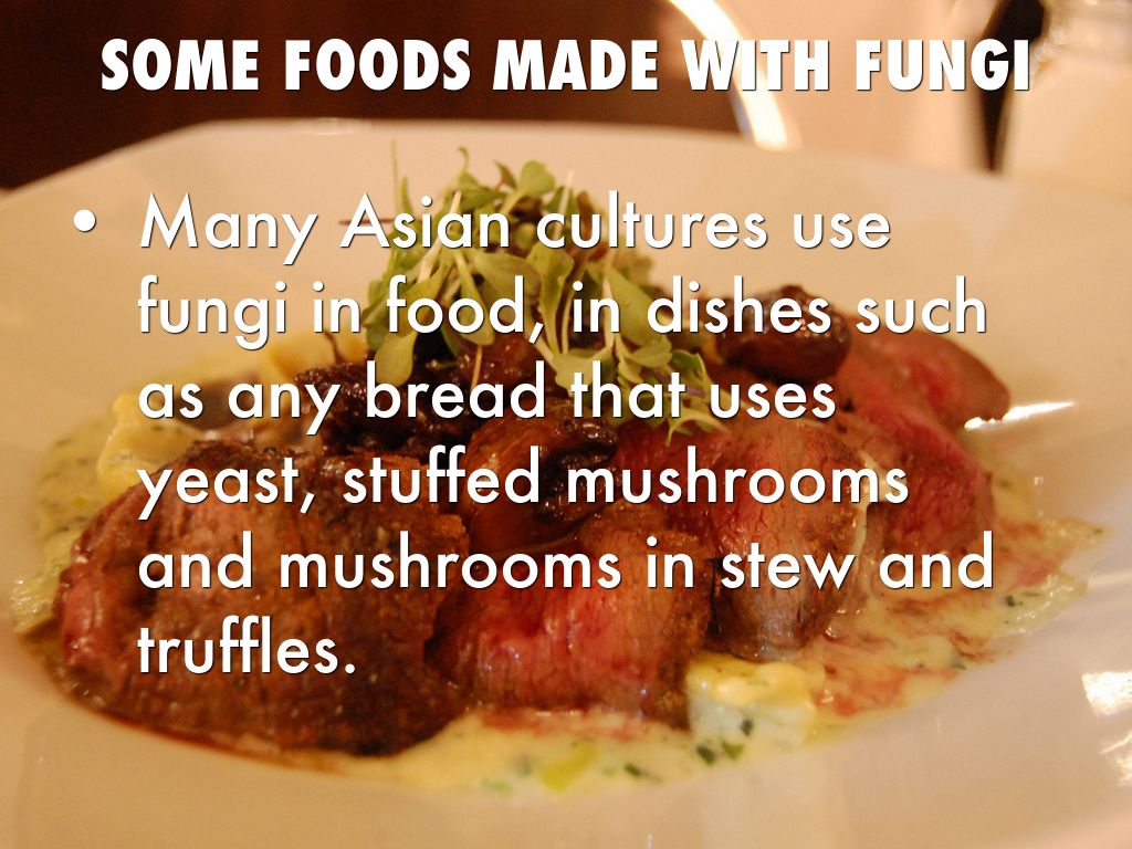 Many Asian cultures use fungi in food, in dishes such as any bread that uses yeast, stuffed mushrooms and mushrooms in stew and truffles.