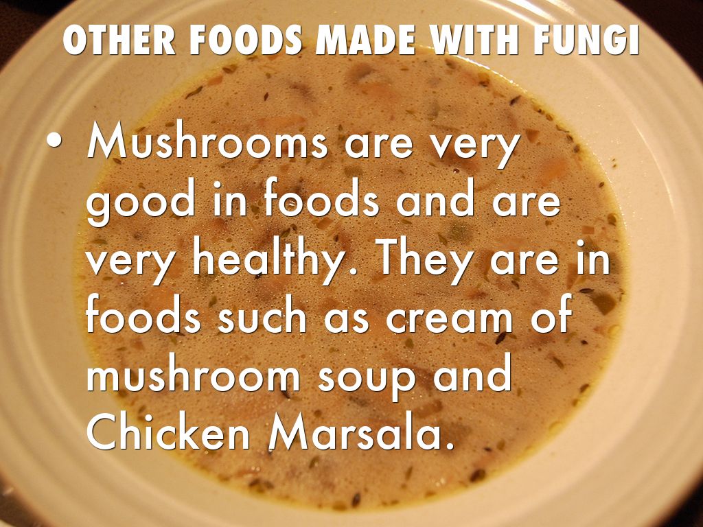 Mushrooms are very good in foods and are very healthy. They are in foods such as cream of mushroom soup and Chicken Marsala.