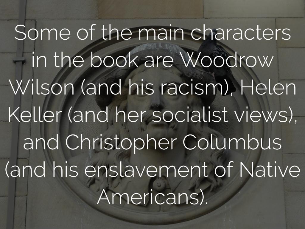 Some of the main characters in the book are Woodrow Wilson (and his racism), Helen Keller (and her socialist views), and Christopher Columbus (and his enslavement of Native Americans).