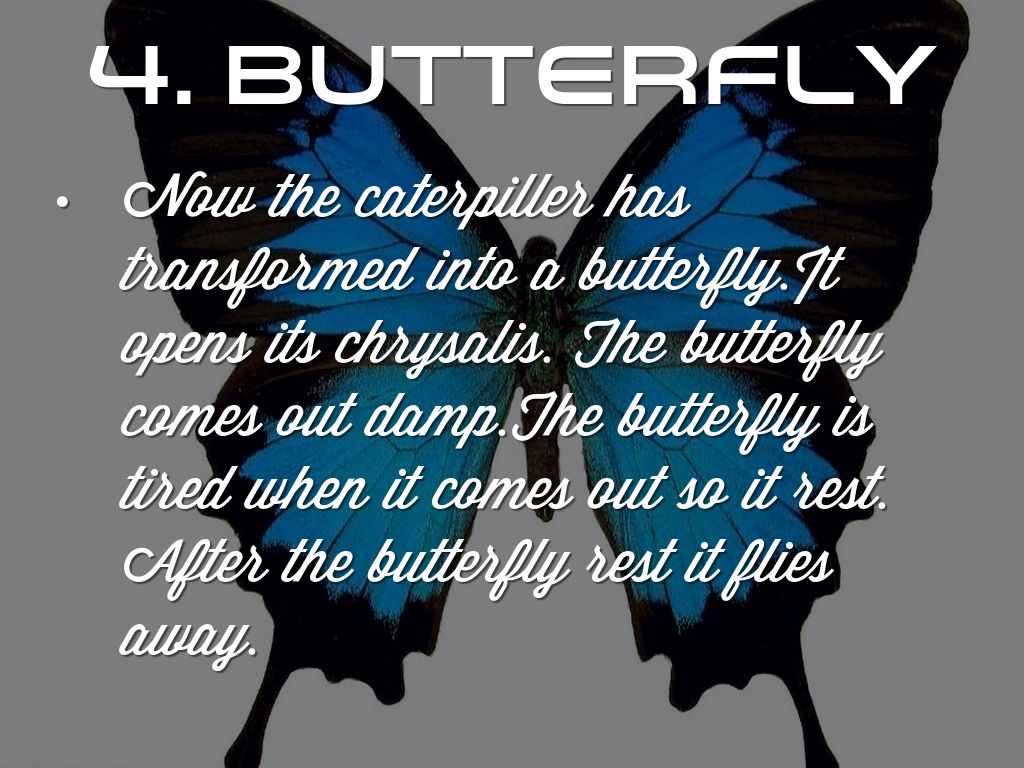 Now the caterpiller has transformed into a butterfly.It opens its chrysalis. The butterfly comes out damp.The butterfly is tired when it comes out so it rest. After the butterfly rest it flies away.
