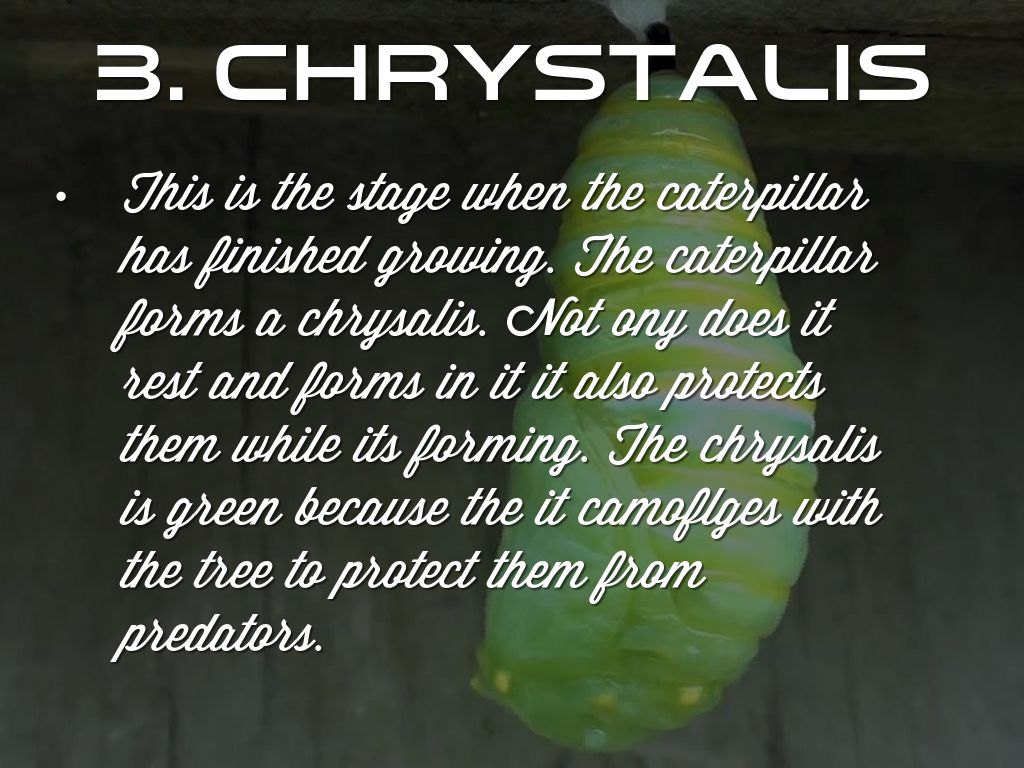 This is the stage when the caterpillar has finished growing. The caterpillar forms a chrysalis. Not ony does it rest and forms in it it also protects them while its forming. The chrysalis is green because the it camoflges with the tree to protect them from predators.
