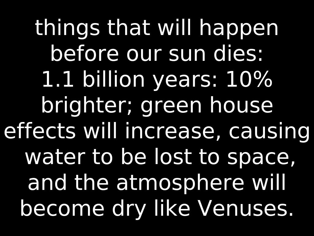 1.1 billion years: 10% brighter; green house effects will increase, causing water to be lost to space, and the atmosphere will become dry like Venuses.