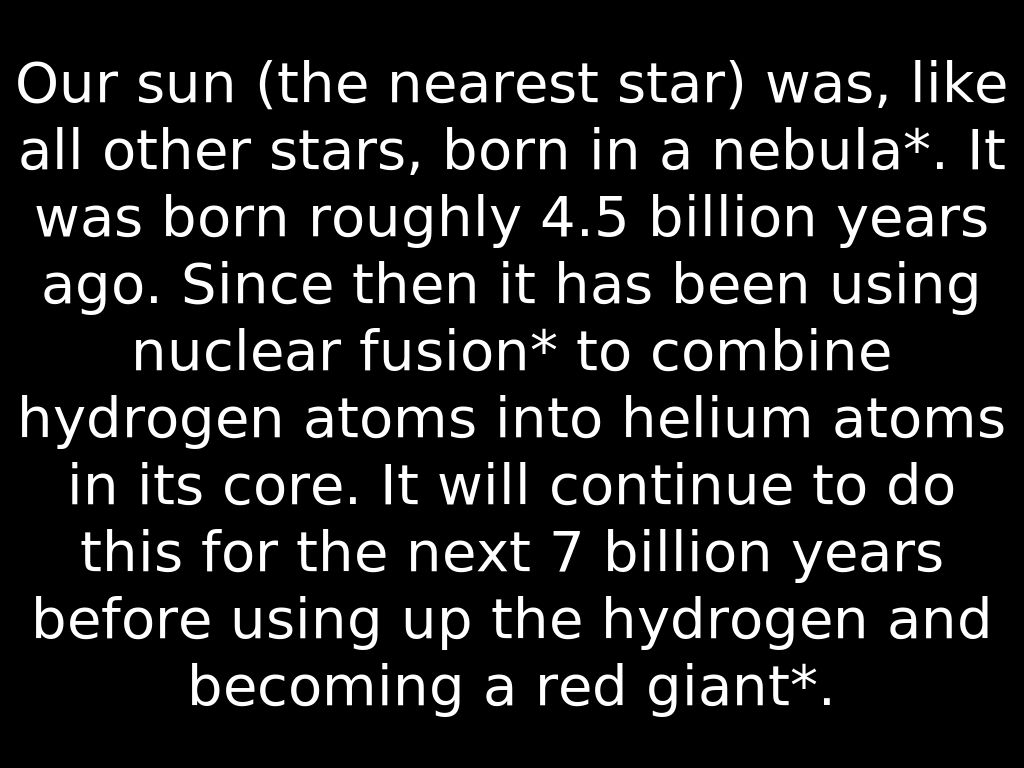 Our sun (the nearest star) was, like all other stars, born in a nebula*. It was born roughly 4.5 billion years ago. Since then it has been using nuclear fusion* to combine hydrogen atoms into helium atoms in its core. It will continue to do this for the next 7 billion years before using up the hydrogen and becoming a red giant*.