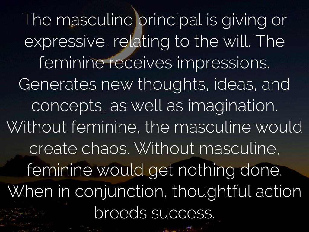 The masculine principal is giving or expressive, relating to the will. The feminine receives impressions. Generates new thoughts, ideas, and concepts, as well as imagination. Without feminine, the masculine would create chaos. Without masculine, feminine would get nothing done. When in conjunction, thoughtful action breeds success.