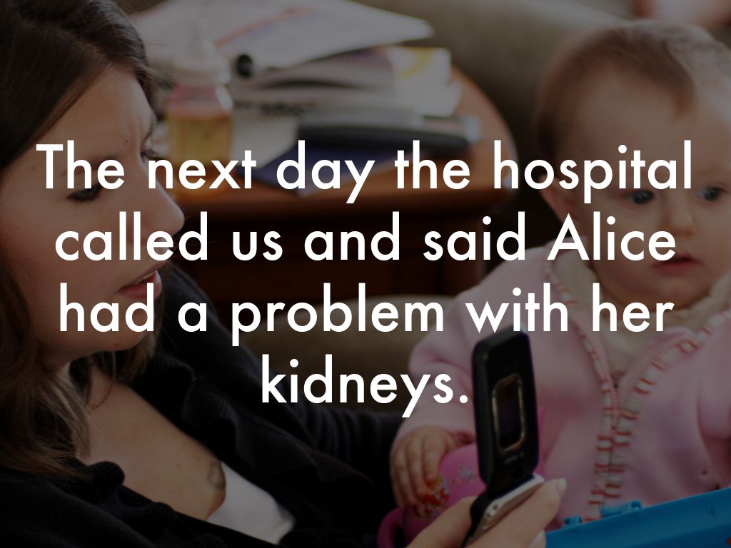 The next day the hospital called us and said Alice had a problem with her kidneys.