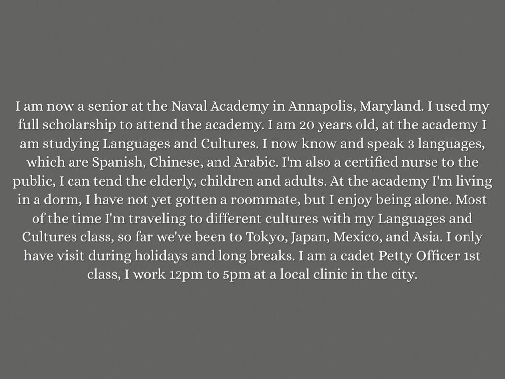 I am now a senior at the Naval Academy in Annapolis, Maryland. I used my full scholarship to attend the academy. I am 20 years old, at the academy I am studying Languages and Cultures. I now know and speak 3 languages, which are Spanish, Chinese, and Arabic. I'm also a certified nurse to the public, I can tend the elderly, children and adults. At the academy I'm living in a dorm, I have not yet gotten a roommate, but I enjoy being alone. Most of the time I'm traveling to different cultures with my Languages and Cultures class, so far we've been to Tokyo, Japan, Mexico, and Asia. I only have visit during holidays and long breaks. I am a cadet Petty Officer 1st class, I work 12pm to 5pm at a local clinic in the city.