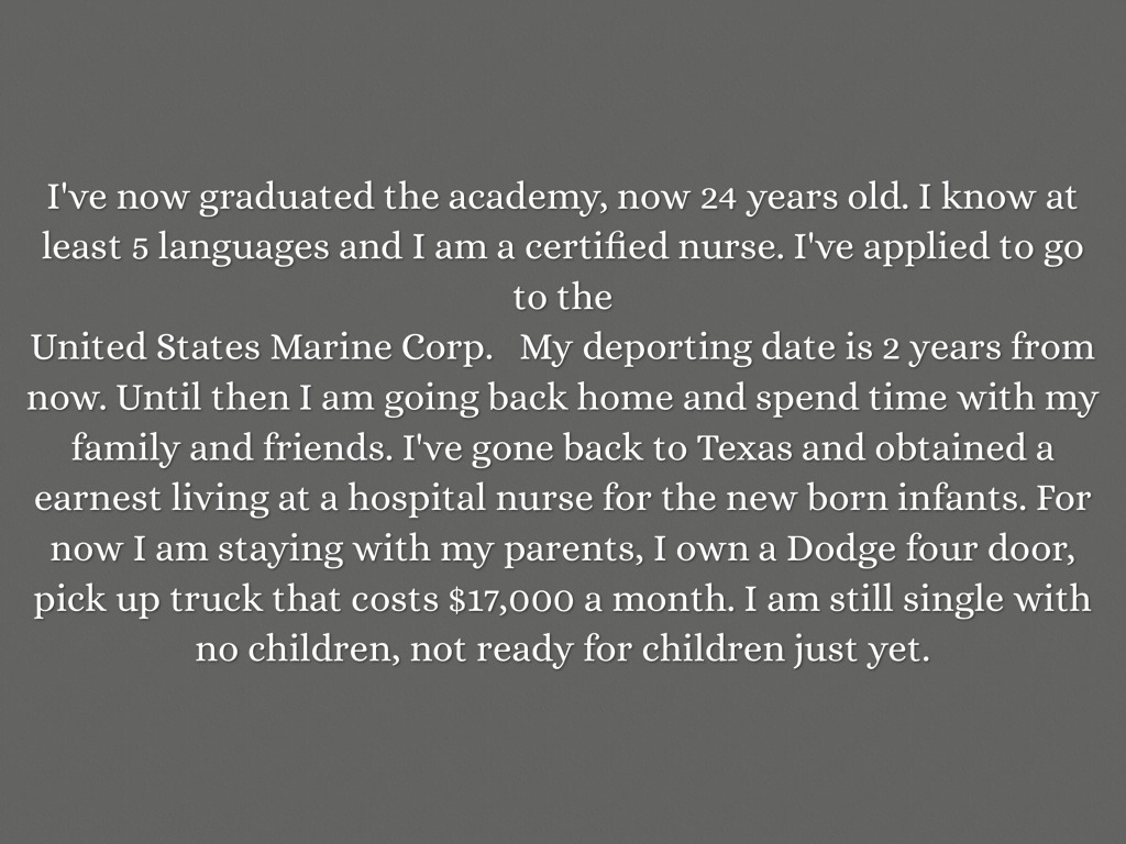 United States Marine Corp. My deporting date is 2 years from now. Until then I am going back home and spend time with my family and friends. I've gone back to Texas and obtained a earnest living at a hospital nurse for the new born infants. For now I am staying with my parents, I own a Dodge four door, pick up truck that costs $17,000 a month. I am still single with no children, not ready for children just yet.
