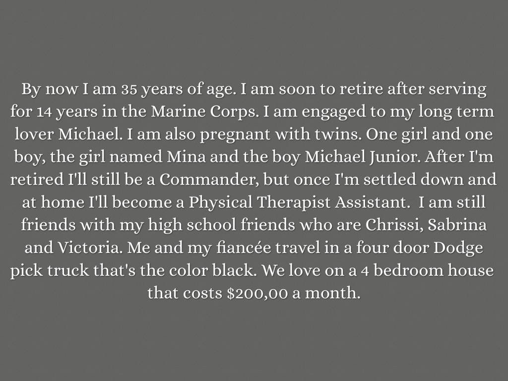 By now I am 35 years of age. I am soon to retire after serving for 14 years in the Marine Corps. I am engaged to my long term lover Michael. I am also pregnant with twins. One girl and one boy, the girl named Mina and the boy Michael Junior. After I'm retired I'll still be a Commander, but once I'm settled down and at home I'll become a Physical Therapist Assistant. I am still friends with my high school friends who are Chrissi, Sabrina and Victoria. Me and my fiancée travel in a four door Dodge pick truck that's the color black. We love on a 4 bedroom house that costs $200,00 a month.