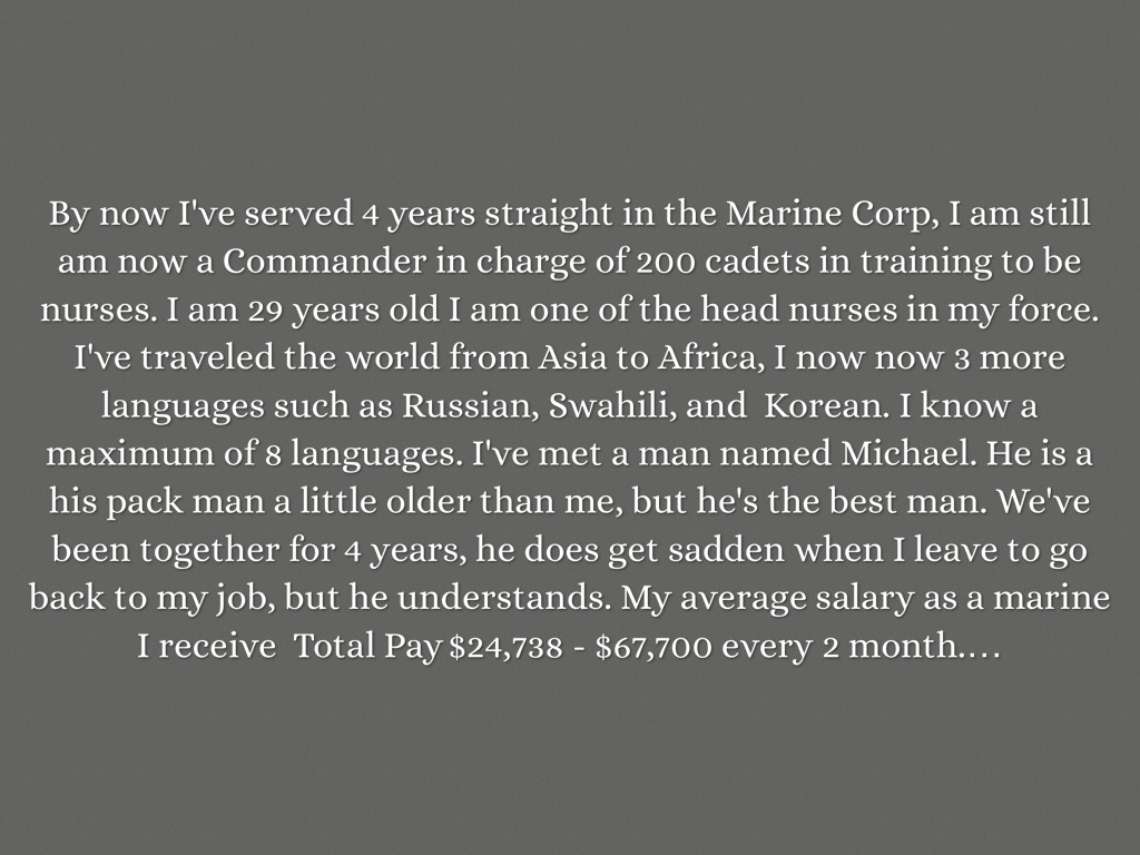 By now I've served 4 years straight in the Marine Corp, I am still am now a Commander in charge of 200 cadets in training to be nurses. I am 29 years old I am one of the head nurses in my force. I've traveled the world from Asia to Africa, I now now 3 more languages such as Russian, Swahili, and Korean. I know a maximum of 8 languages. I've met a man named Michael. He is a his pack man a little older than me, but he's the best man. We've been together for 4 years, he does get sadden when I leave to go back to my job, but he understands. My average salary as a marine I receive Total Pay $24,738 - $67,700 every 2 month.