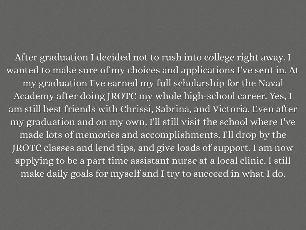 After graduation I decided not to rush into college right away. I wanted to make sure of my choices and applications I've sent in. At my graduation I've earned my full scholarship for the Naval Academy after doing JROTC my whole high-school career. Yes, I am still best friends with Chrissi, Sabrina, and Victoria. Even after my graduation and on my own, I'll still visit the school where I've made lots of memories and accomplishments. I'll drop by the JROTC classes and lend tips, and give loads of support. I am now applying to be a part time assistant nurse at a local clinic. I still make daily goals for myself and I try to succeed in what I do.