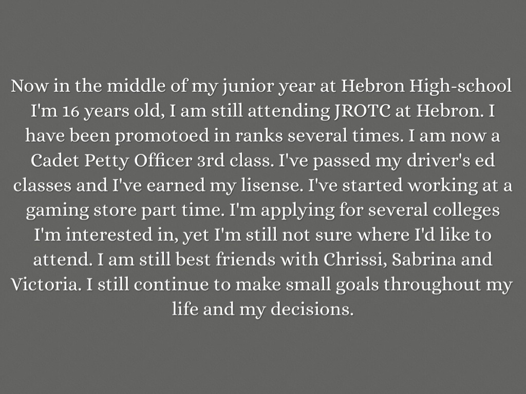 Now in the middle of my junior year at Hebron High-school I'm 16 years old, I am still attending JROTC at Hebron. I have been promotoed in ranks several times. I am now a Cadet Petty Officer 3rd class. I've passed my driver's ed classes and I've earned my lisense. I've started working at a gaming store part time. I'm applying for several colleges I'm interested in, yet I'm still not sure where I'd like to attend. I am still best friends with Chrissi, Sabrina and Victoria. I still continue to make small goals throughout my life and my decisions.