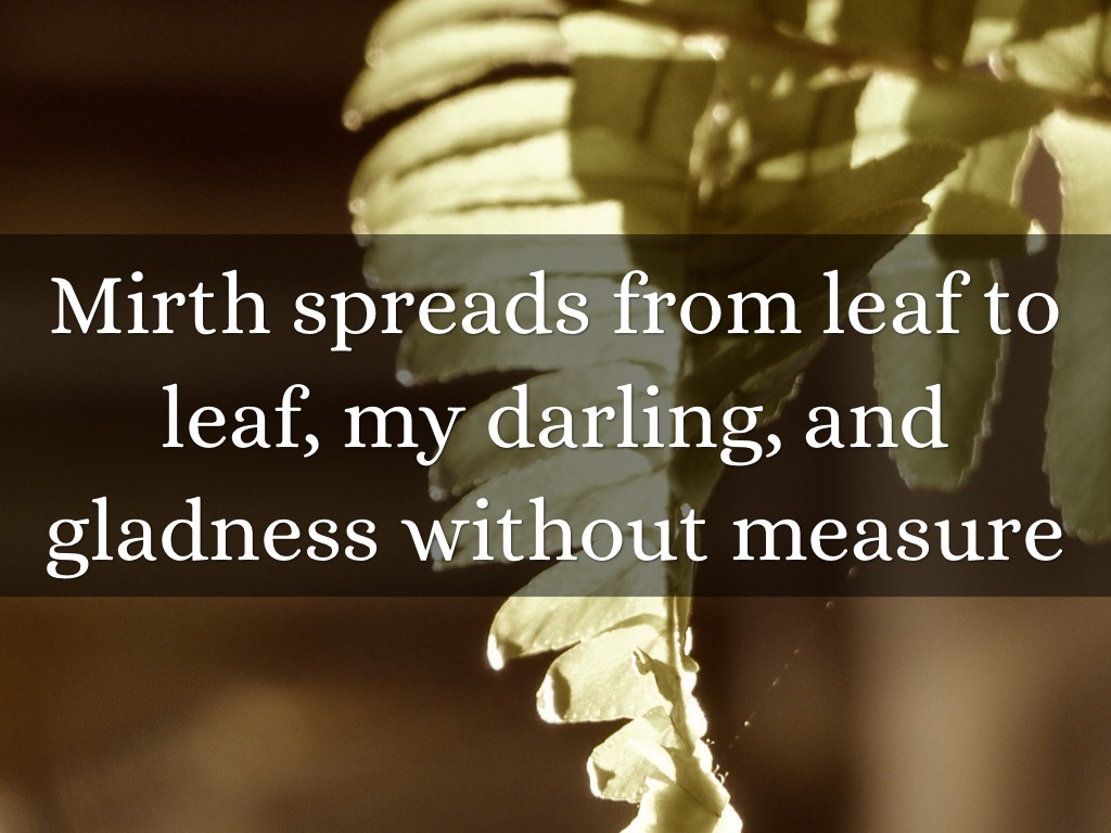 Mirth spreads from leaf to leaf, my darling, and gladness without measure