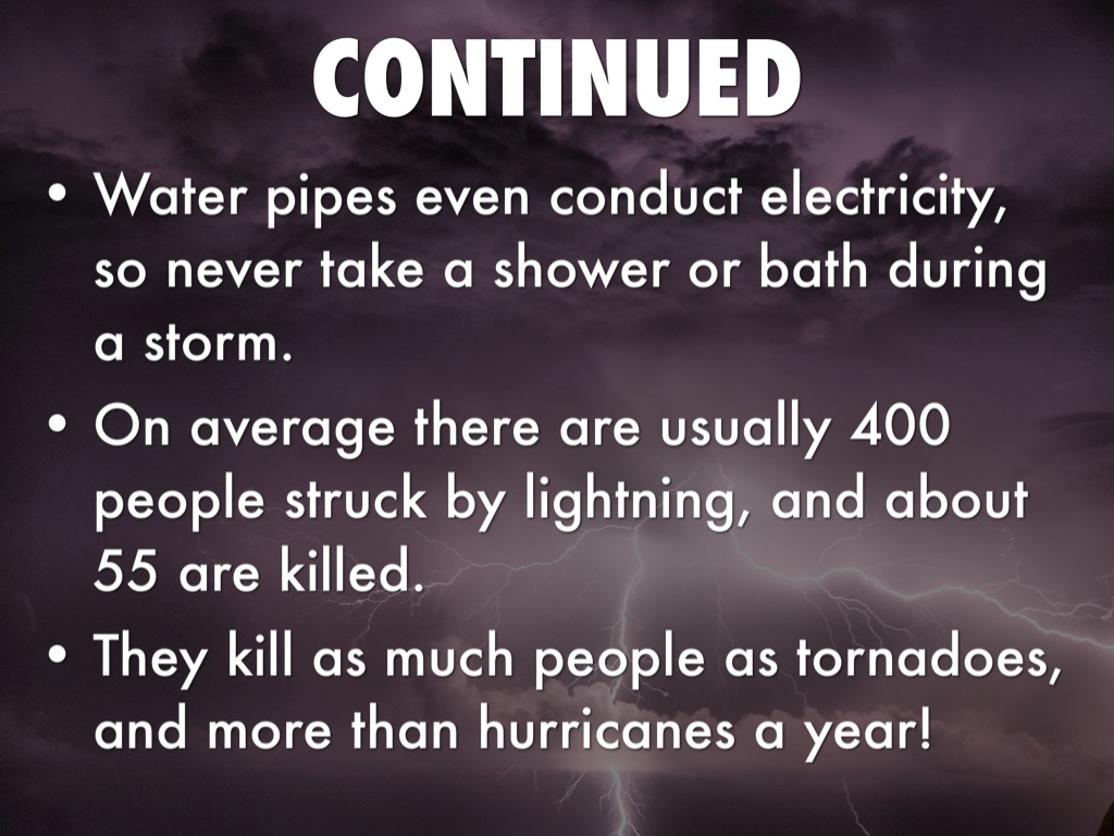 Water pipes even conduct electricity, so never take a shower or bath during a storm.