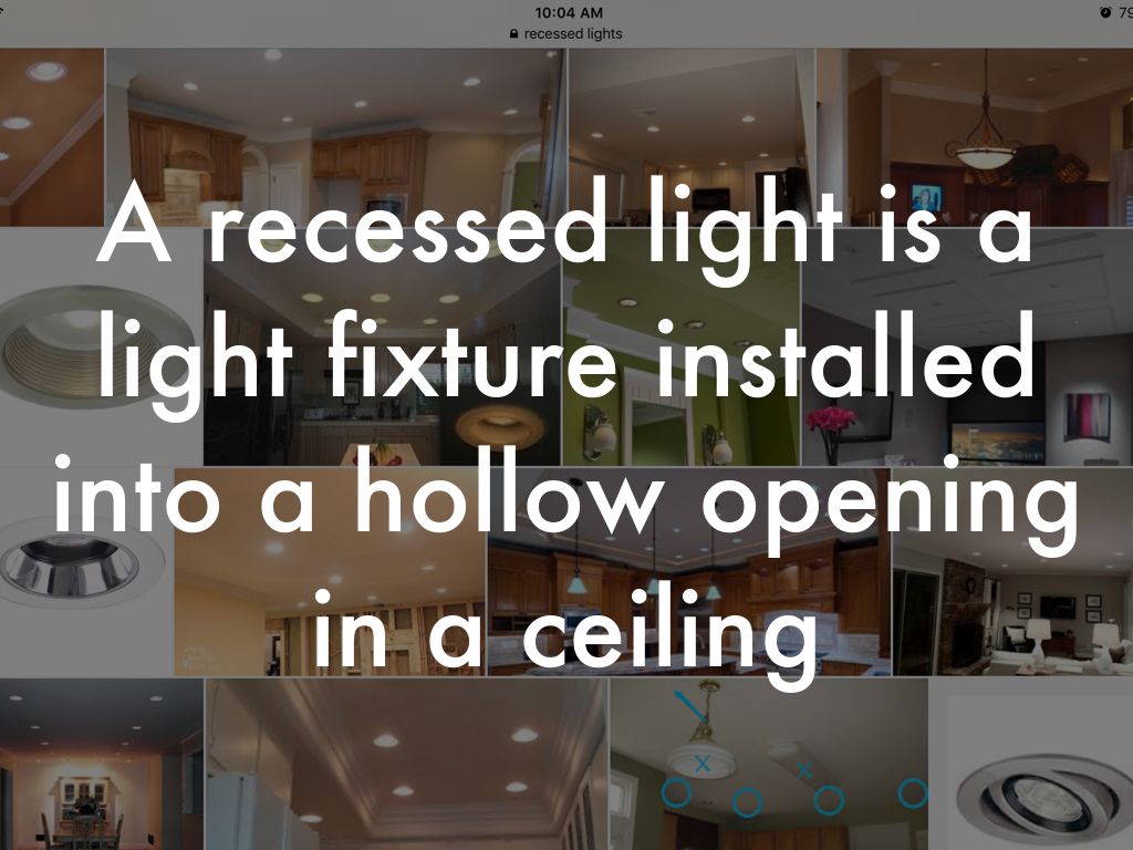 A recessed light is a light fixture installed into a hollow opening in a ceiling