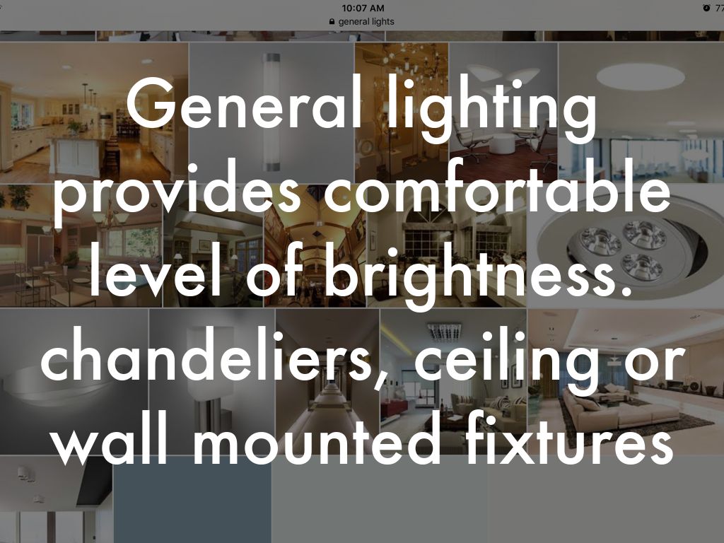 General lighting provides comfortable level of brightness. chandeliers, ceiling or wall mounted fixtures