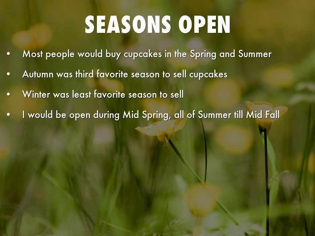 I would be open during Mid Spring, all of Summer till Mid Fall
