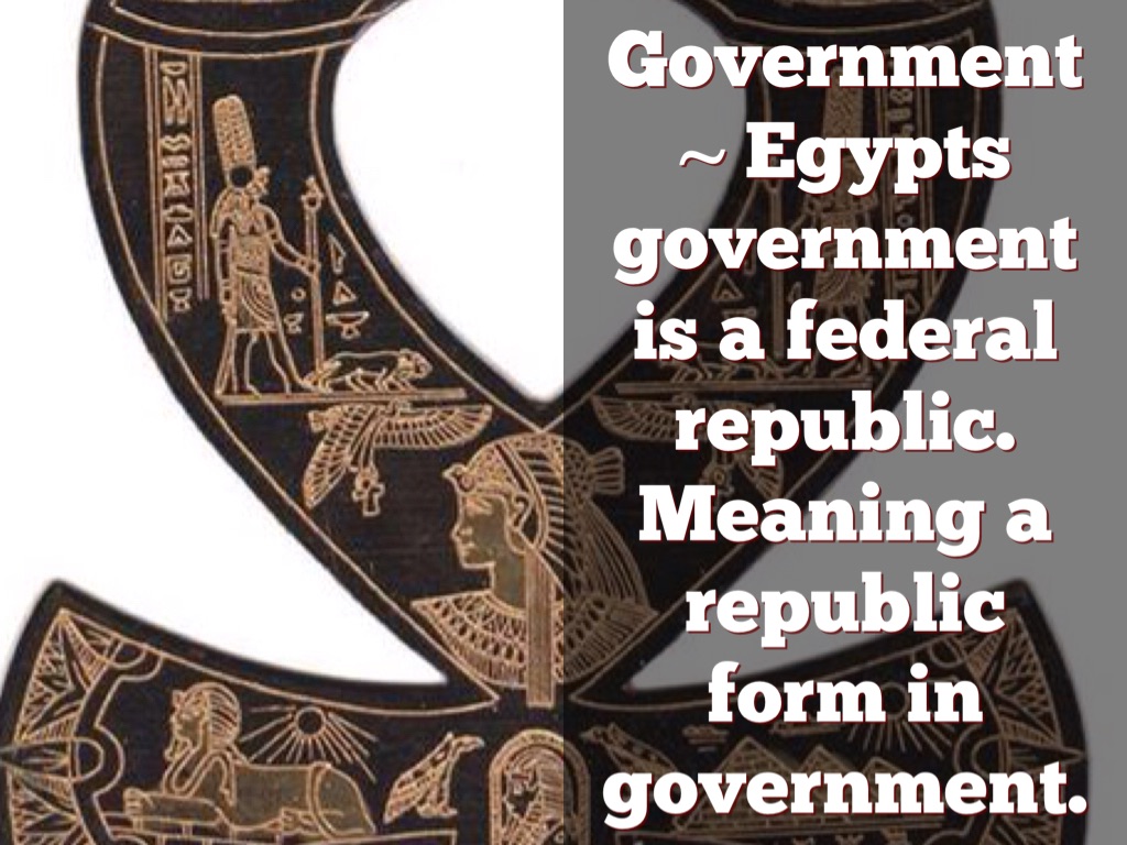 Government~ Egypts government is a federal republic. Meaning a republic form in government.