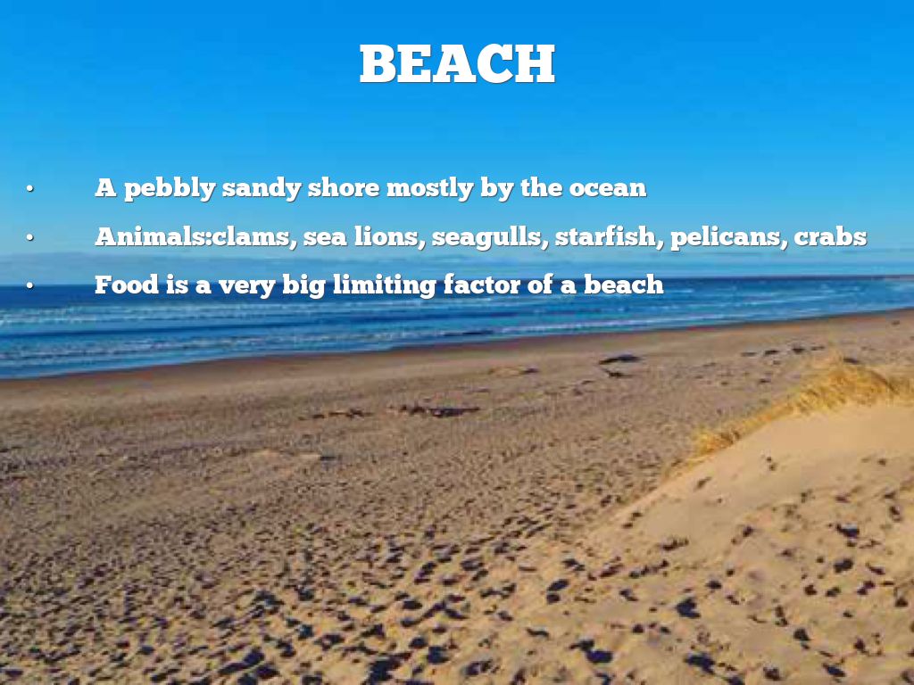 Animals:clams, sea lions, seagulls, starfish, pelicans, crabs