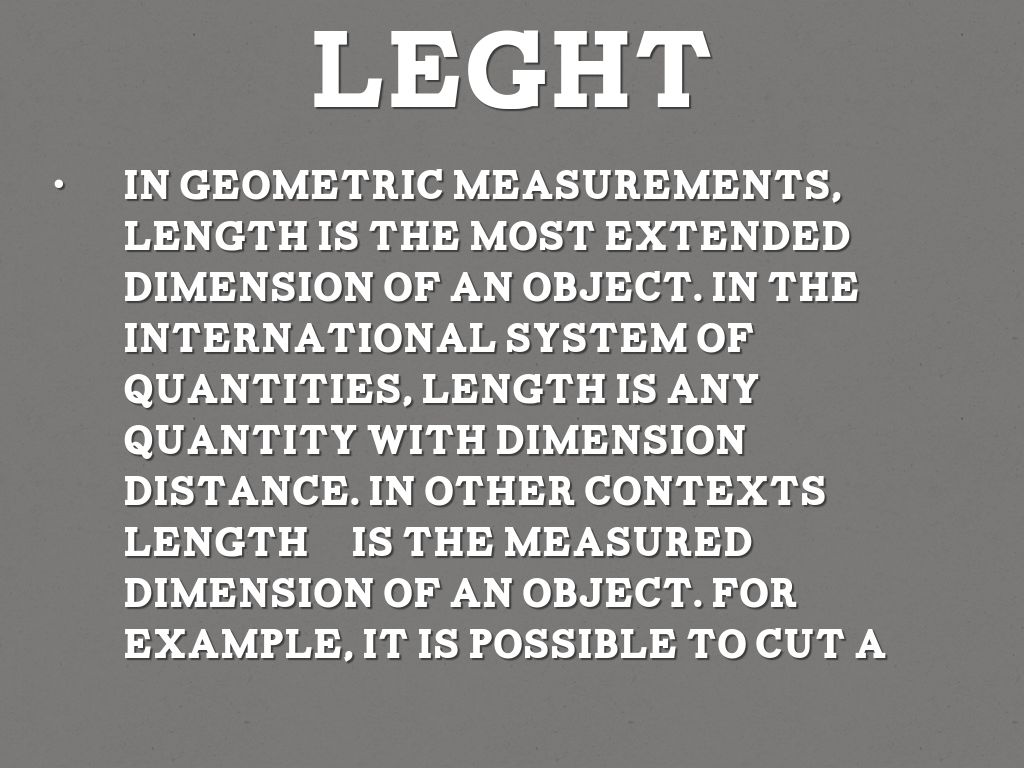 in geometric measurements, length is the most extended dimension of an object. In the International System of Quantities, length is any quantity with dimension distance. In other contexts length" is the measured dimension of an object. For example, it is possible to cut a length of a wire which is shorter than wire thickness.