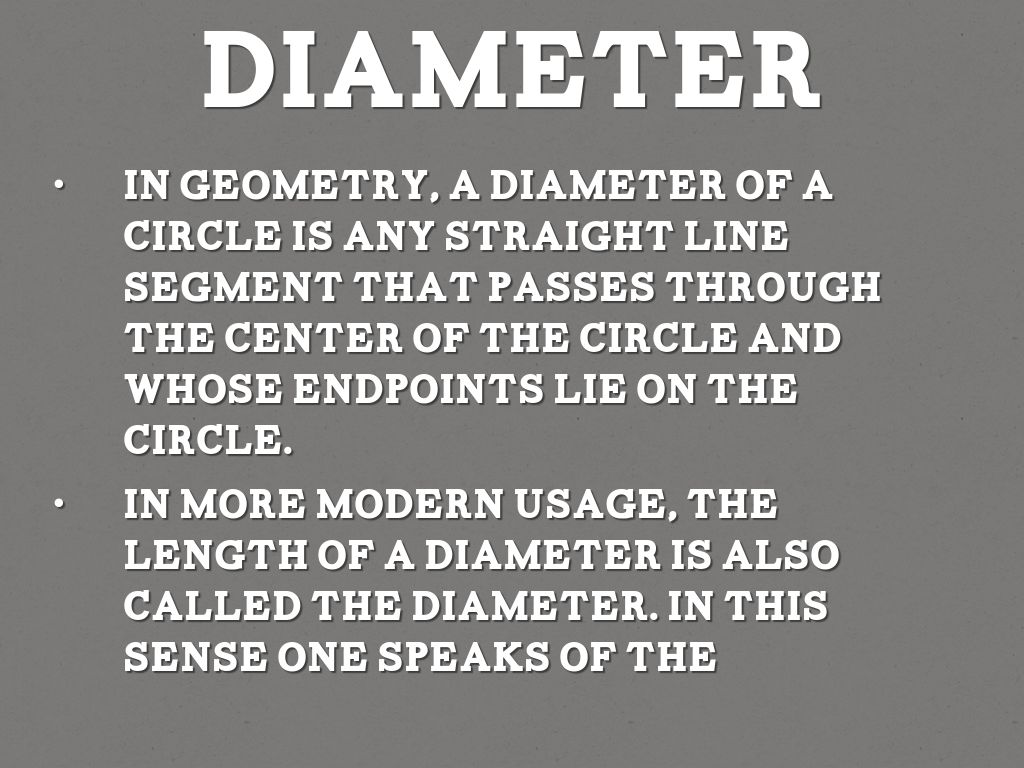 In geometry, a diameter of a circle is any straight line segment that passes through the center of the circle and whose endpoints lie on the circle.