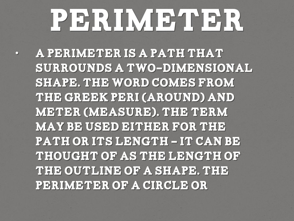 A perimeter is a path that surrounds a two-dimensional shape. The word comes from the Greek peri (around) and meter (measure). The term may be used either for the path or its length - it can be thought of as the length of the outline of a shape. The perimeter of a circle or ellipse is called its circumference.