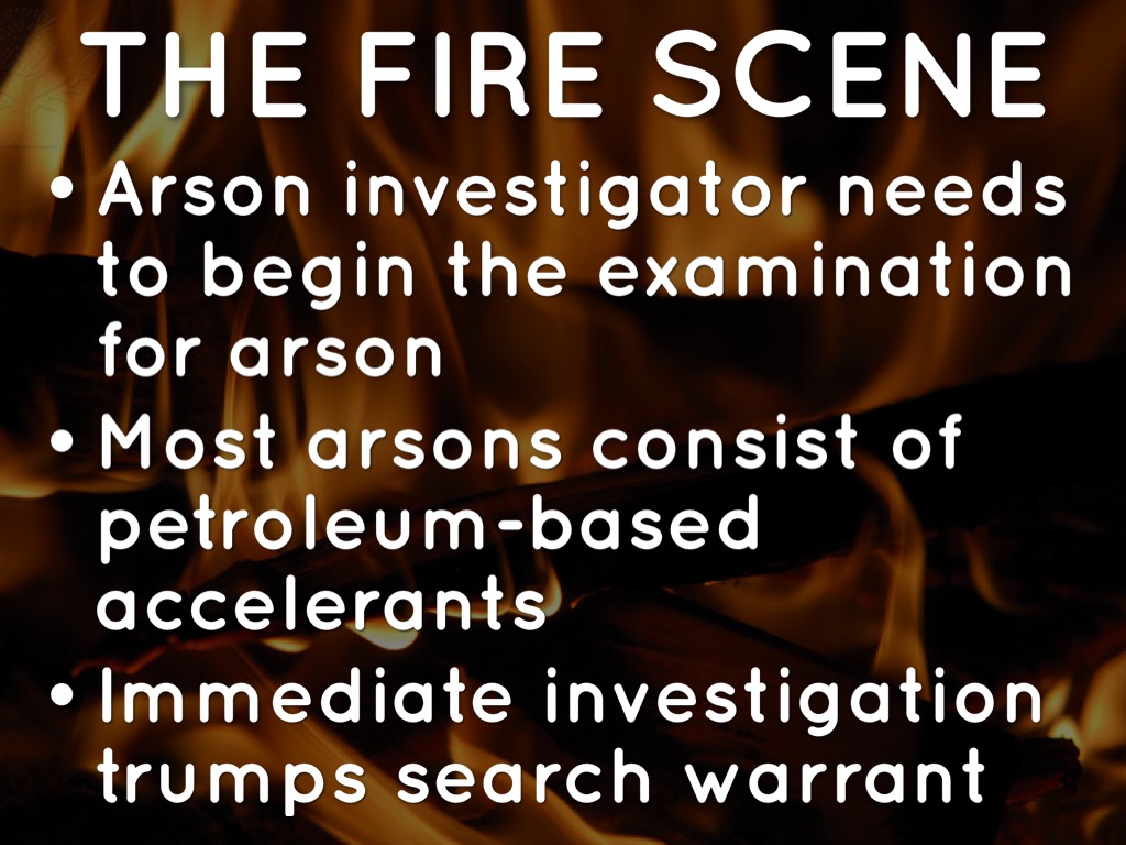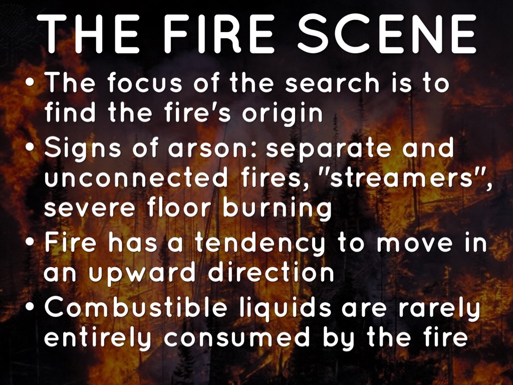 Signs of arson: separate and unconnected fires, "streamers", severe floor burning
