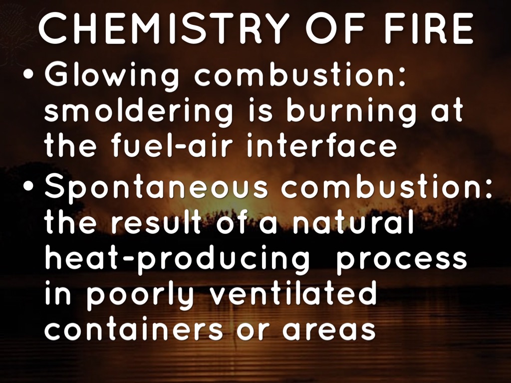 Spontaneous combustion: the result of a natural heat-producing process in poorly ventilated containers or areas