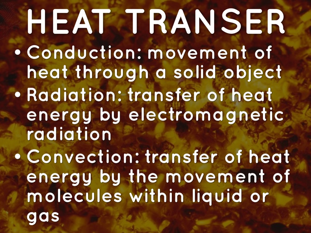 Convection: transfer of heat energy by the movement of molecules within liquid or gas