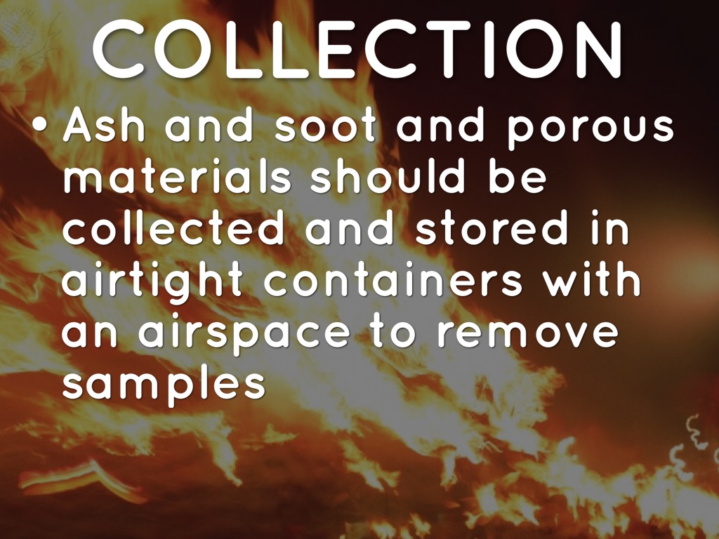 Ash and soot and porous materials should be collected and stored in airtight containers with an airspace to remove samples
