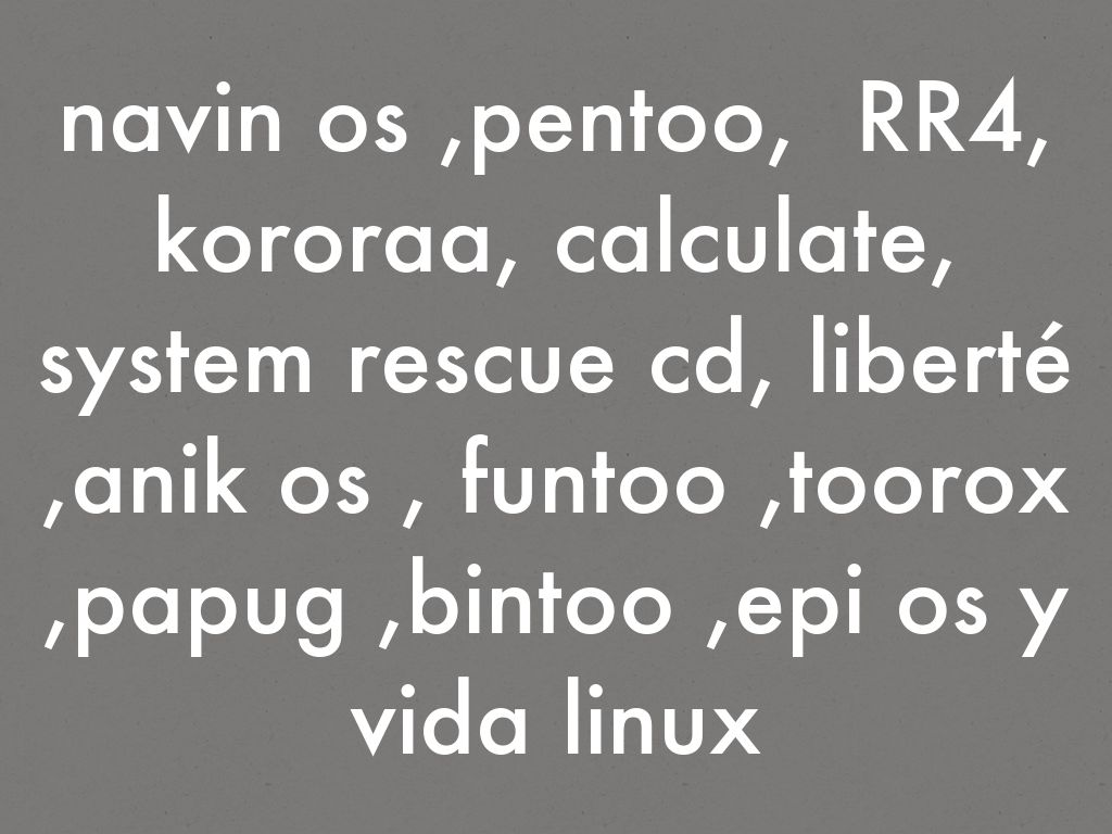 navin os ,pentoo, RR4, kororaa, calculate, system rescue cd, liberté ,anik os , funtoo ,toorox ,papug ,bintoo ,epi os y vida linux