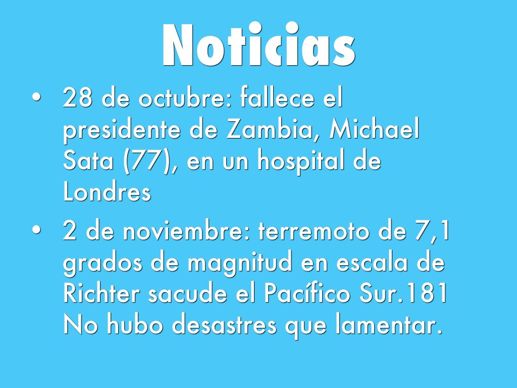 • 28 de octubre: fallece el presidente de Zambia, Michael Sata (77), en un hospital de Londres