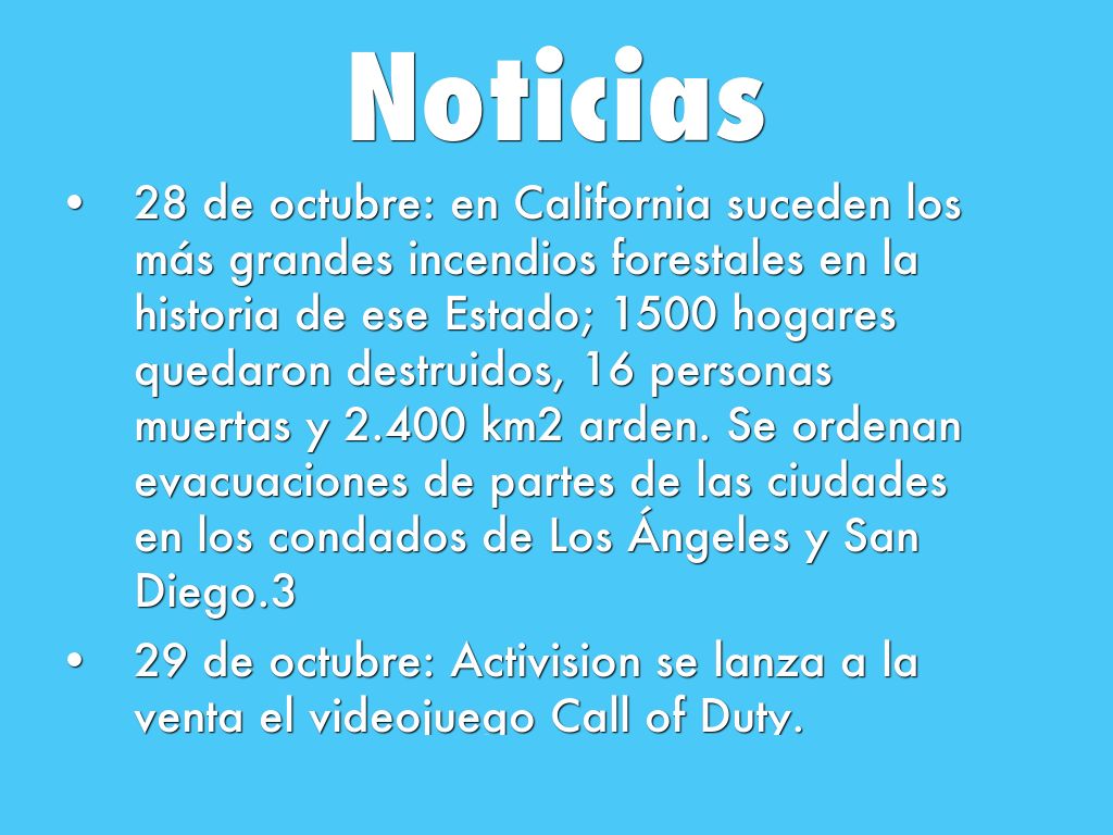 • 29 de octubre: Activision se lanza a la venta el videojuego Call of Duty.